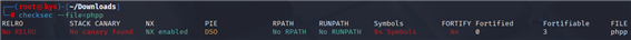 checksec —file~phpp ( 보안 보호기법이 적용되었는지 확인 – 스택보호, PIE, RELRO 등 으로 분석 난이도 판단)