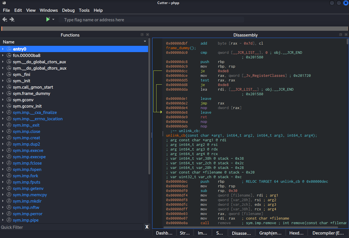 - FUNC항목 중 main, remove, fork, service_interp 등을 찾아 분석 포인트로 삼는다.